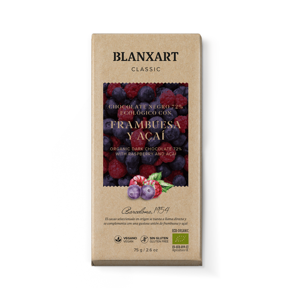 Tableta de chocolate negro ecológico 70% cacao con Frambuesa, Acaí y endulzada con azúcar de coco. Especialidad de alto porcentaje de cacao. Chocolate ecológico, vegano y sin gluten.