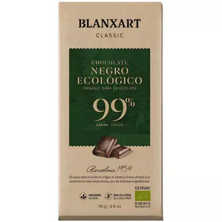 Tableta de chocolate negro ecológico 99% cacao (República Dominicana), procedente de la Provincia de San Cristóbal. Elaborado con cacao fino de la variedad Trinitario. Blanxart crea chocolates exclusivamente con cacao de un único origen, para potenciar la singularidad de cada una de las recetas.