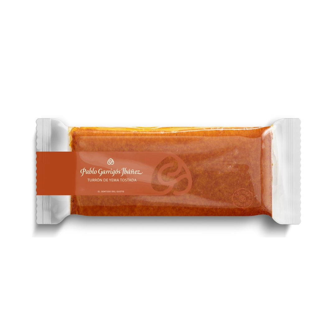 Tableta de delicioso turrón de yema tostada de la gama Delicatessen de Pablo Garrigós Ibáñez en formato 300 gramos y envasado Rilsan.